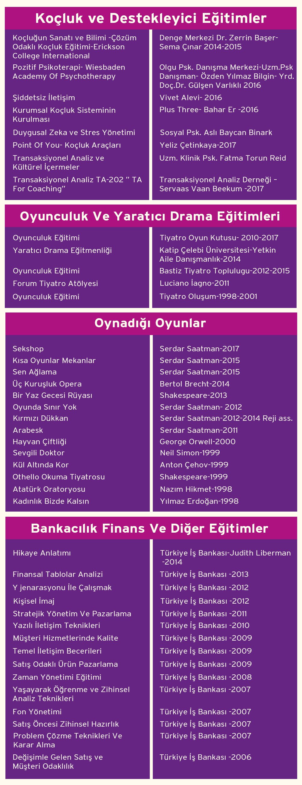 Uluslararası ICF Akredite sertifikalı profesyonel Koç olarak, öğrenciler, yetişkinler ve kurumlar ile gelecek hayali kurma, değişim, iletişim, zaman yönetimi değerler ve takım olma kavramları üzerine bireysel ve kurumsal eğitimler; bireysel seanslar, ayrıca çocuklara ve yetişkinlere yaratıcı drama eğitim ve atölye çalışmalarını İzmir ve İstanbul’da yürütmektedir.